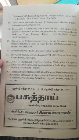 ஏசு கிறிஸ்து என்று மதத்தின் போர்வையில், வெளிநாட்டு அரக்கர்கள் மெதுமெதுவாக நம்மையும் நம் கலாசாரத்தையும் அழித்து தங்கள் ஆதிக்க வெறியை நம் நாட்டில் நிலை நாட்ட, அவர்களின் கருப்பு கோர கைகளால் நம்மை அணைத்து அழித்துக் கொண்டிருக்கிறார்கள் என்ற செய்தியை இந்த புத்தகம் தெளிவாக உணர வைக்கிறது. இன்னும் நாம் ஒற்றுமை இல்லாமலும், உறங்கிக் கொண்டும், டி.வி. பார்த்துக் கொண்டும் இருந்தால், நம் குழந்தைகளுக்கும் நம் வருங்கால சந்ததிகளுக்கும் நிம்மதியற்ற வாழ்க்கையினை கொடுத்துவிட்டு, அவர்கள் தலைமுறைக்கும் நம்மை திட்டும் நிலைக்கு தள்ளிவிடுவோம்.