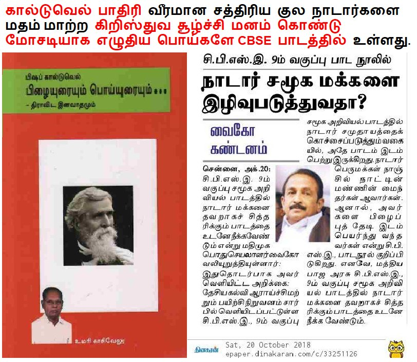 நாடார் ஜாதி மக்கள் சிபிஎஸ்இ பாடத்தில் பாதிரி கால்டுவெல் நூலின் அடிப்படையில் இருந்த குறிப்புகளை நீக்க பெரும் போராட்டம் செய்தனர்.